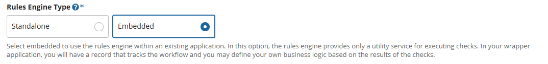 Embedded Mode - Leverage the rules engine within an existing application. In this option, the rules engine provides only a utility service for executing checks. In your wrapper application, you will have a record that tracks the workflow and you may define your own business logic based on the results of the checks.