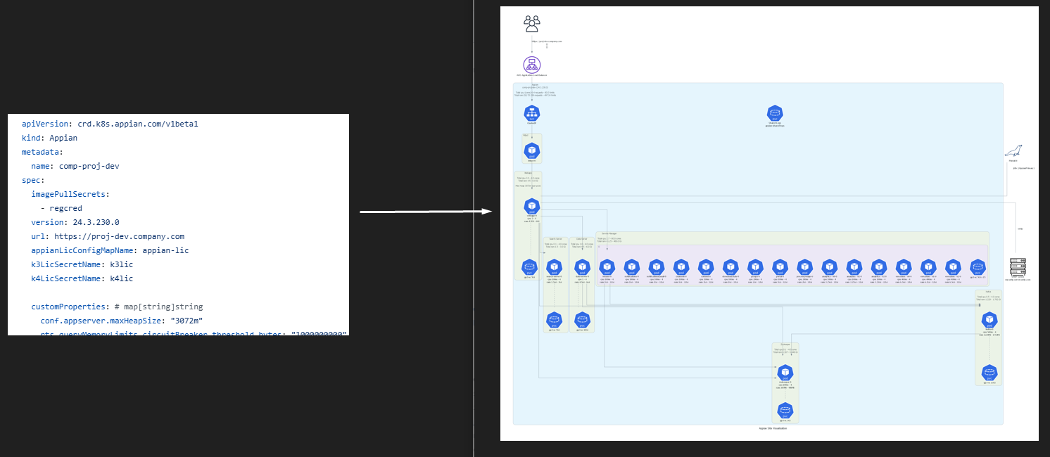 • Config Visualization - convert your Appian on Kubernetes site YAML file into a Kubernetes diagram to visualize your configuration.