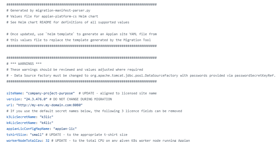• Migration Manifest Parser - enables customers migrating from machine-based Appian environments to Kubernetes using the Migration Tool to take advantage of the best-practice configurations provided by the Appian Platform (CS) Helm Chart.