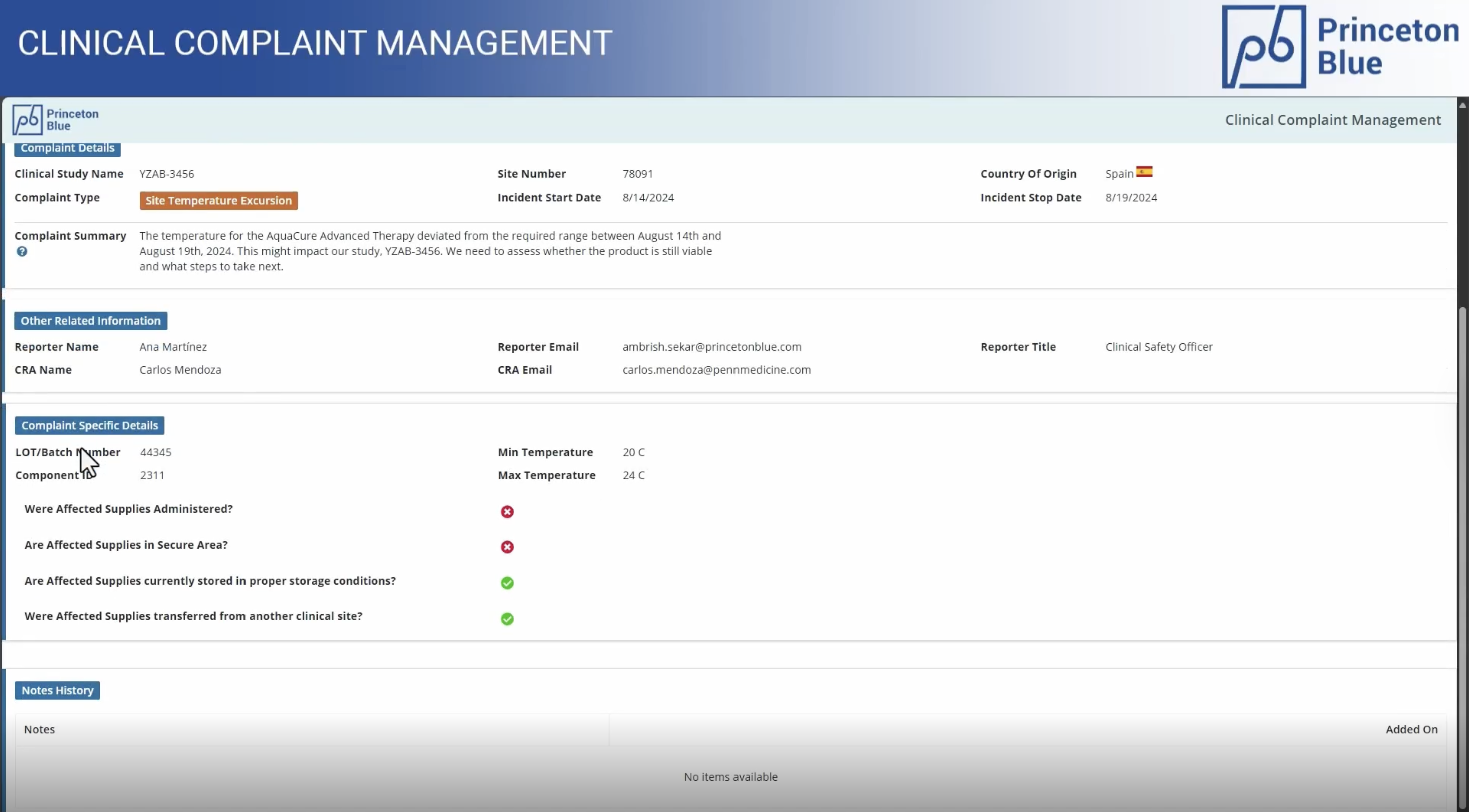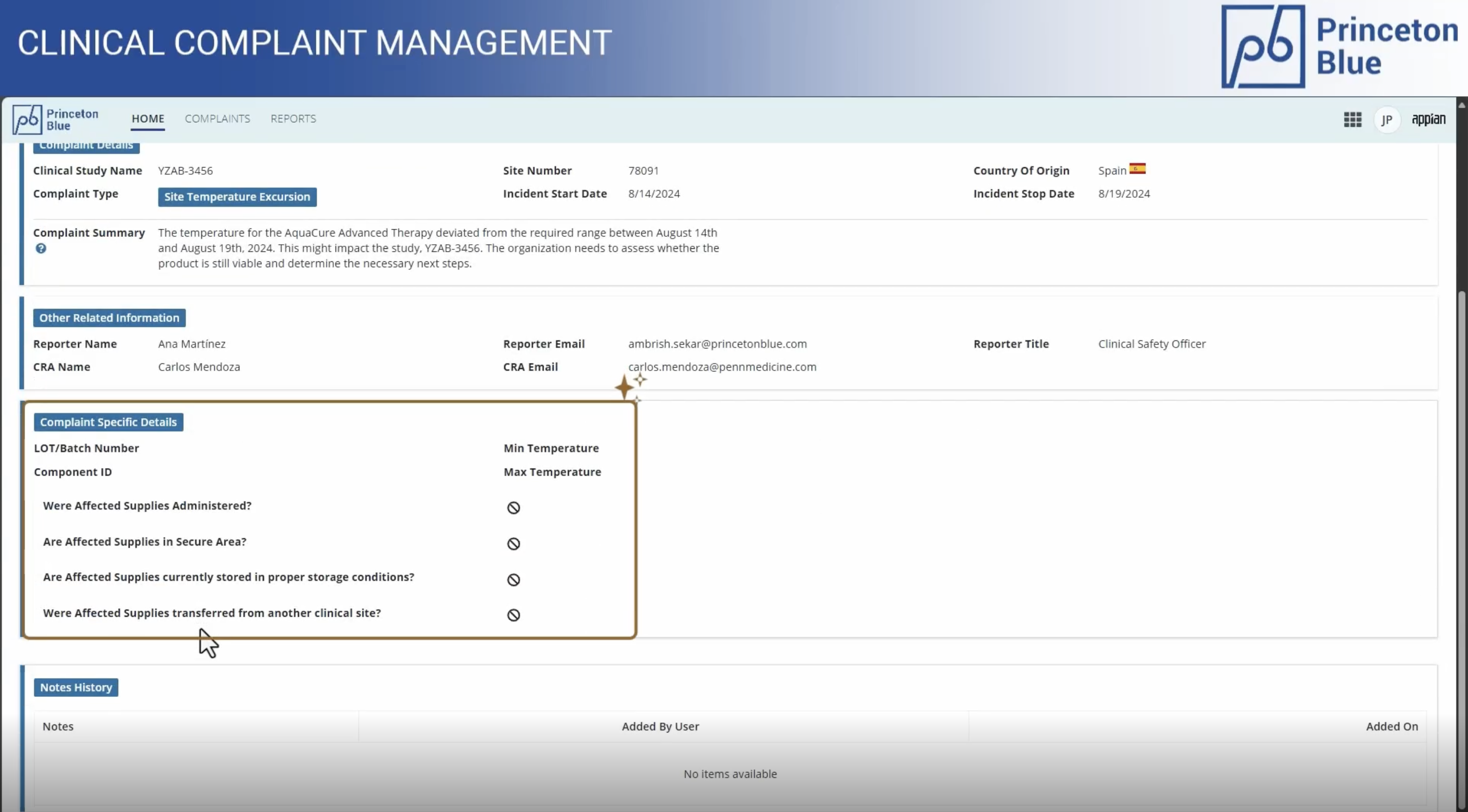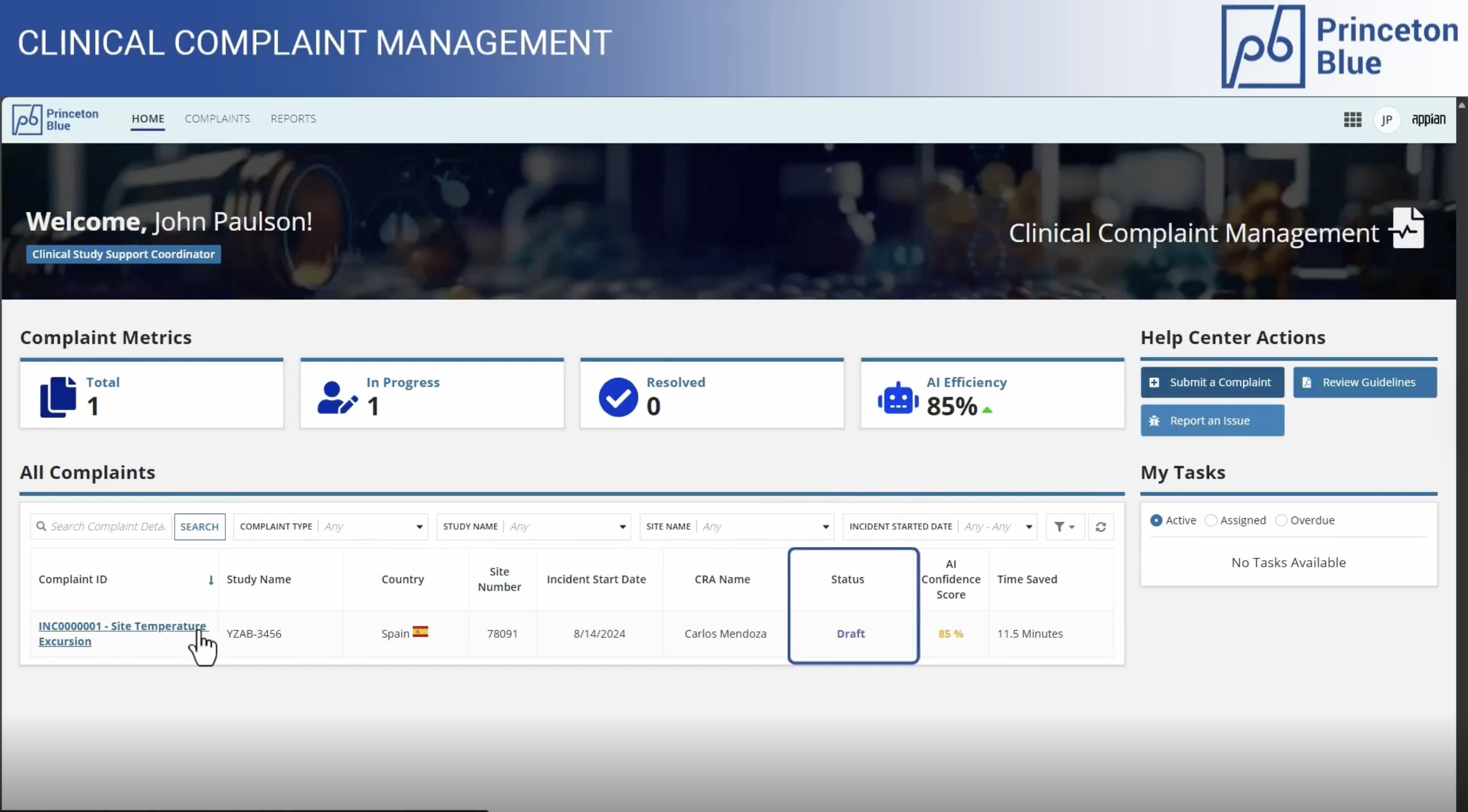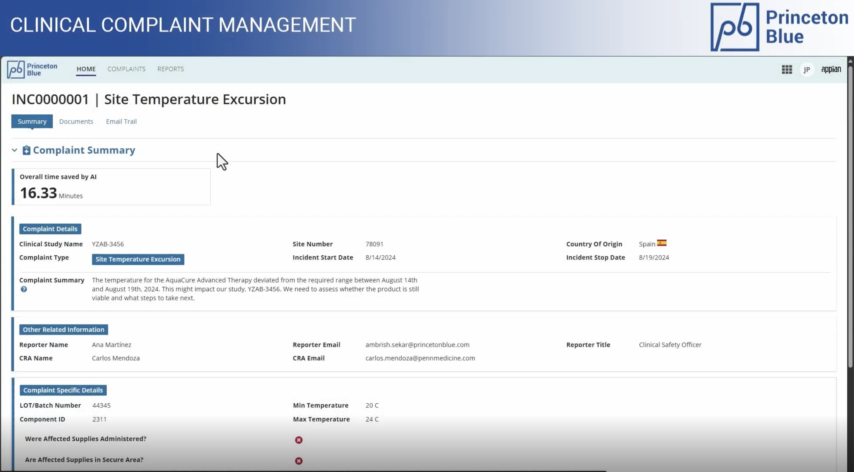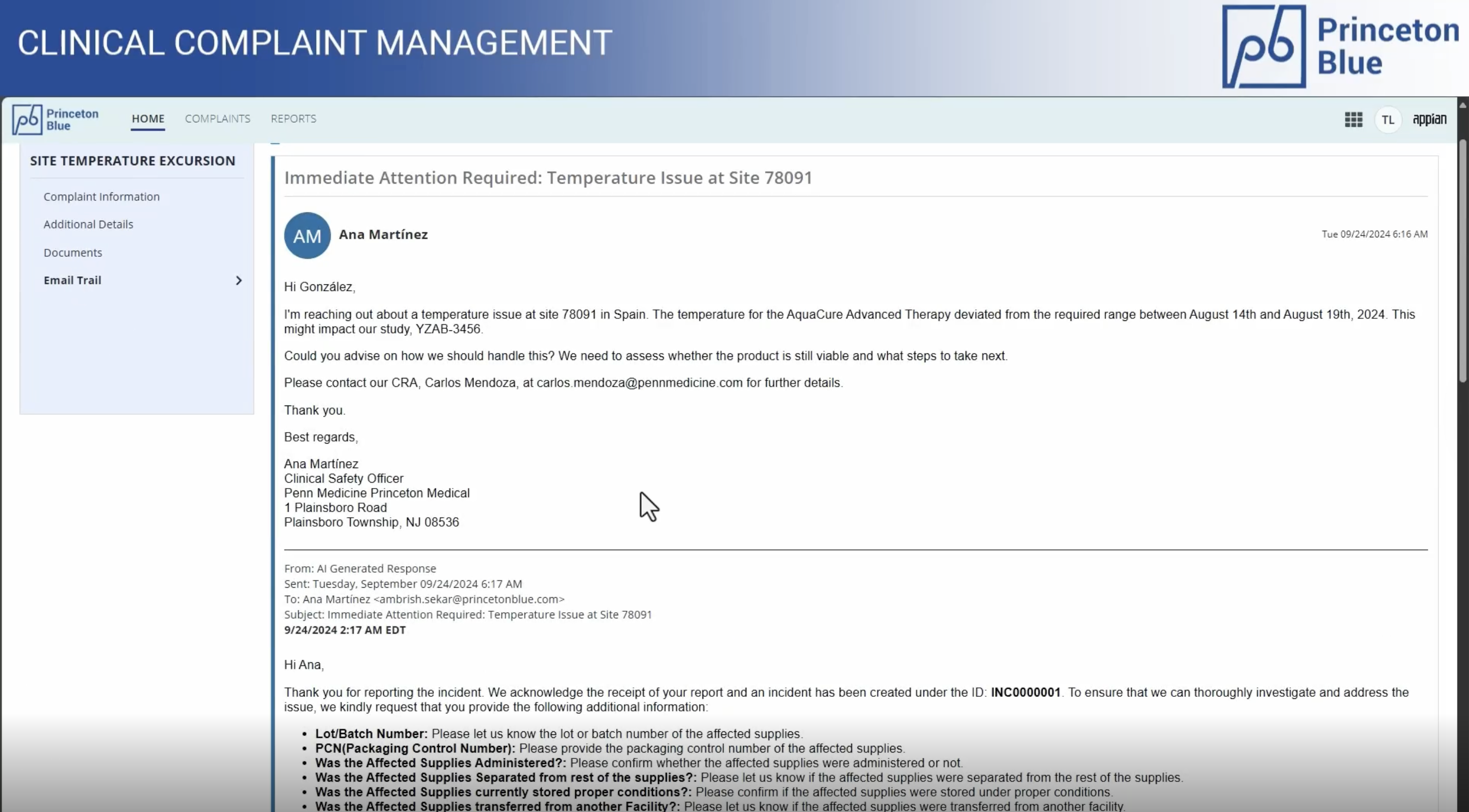 - Limited real-time visibility: Tracking the status of complaints across multiple trials and sites can be difficult, hindering effective management and reporting. Princeton Blue’s Clinical Complaint Management solution leverages Appian AI technology to enhance the efficiency and accuracy of complaint handling in clinical trials. The system automates the initial processing of complaints by analyzing incoming emails, extracting relevant data, and categorizing issues. When information is incomplete, the AI interacts with site personnel to gather additional details, ensuring thorough documentation without manual intervention.