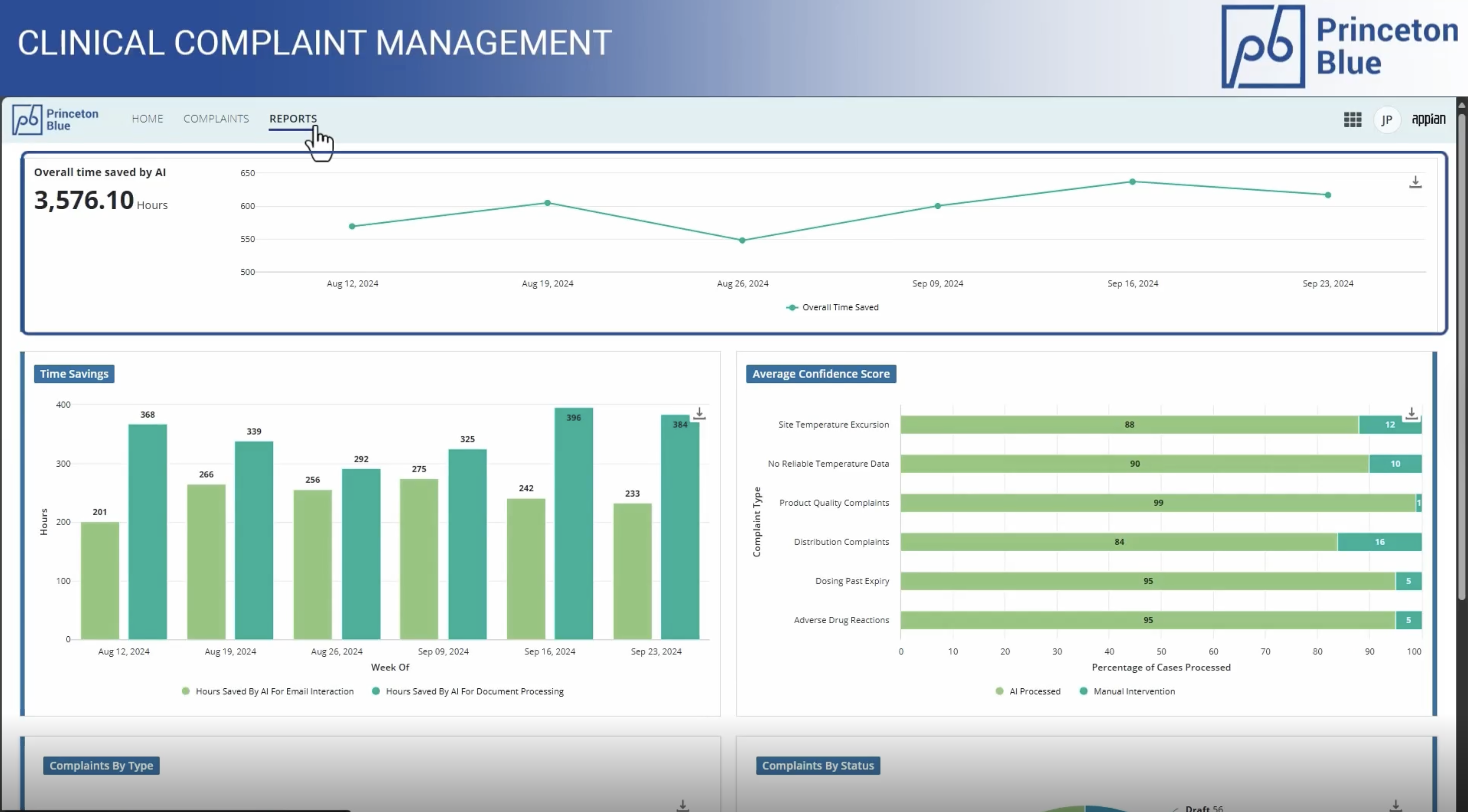 Princeton Blue’s Clinical Complaint Management solution uses Appian AI to improve complaint handling in clinical trials. Appian AI automates complaint review, validation, and categorization, while allowing for human intervention when necessary, reducing processing time and improving accuracy in managing clinical complaints.