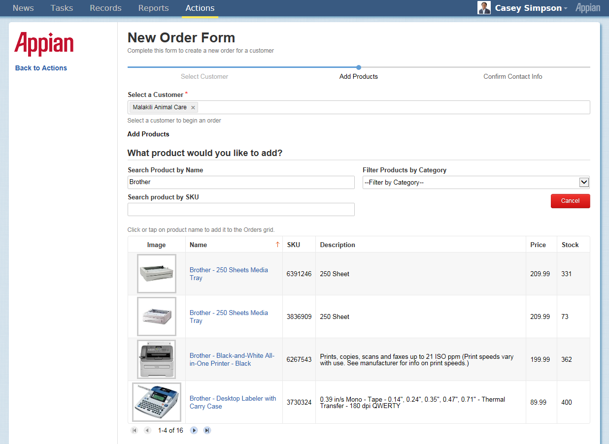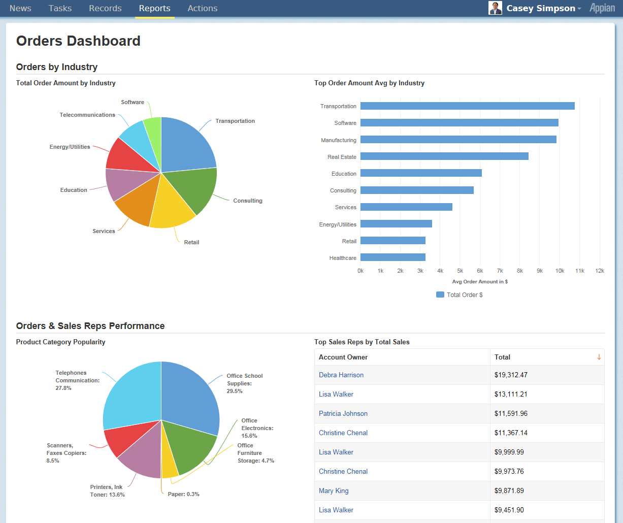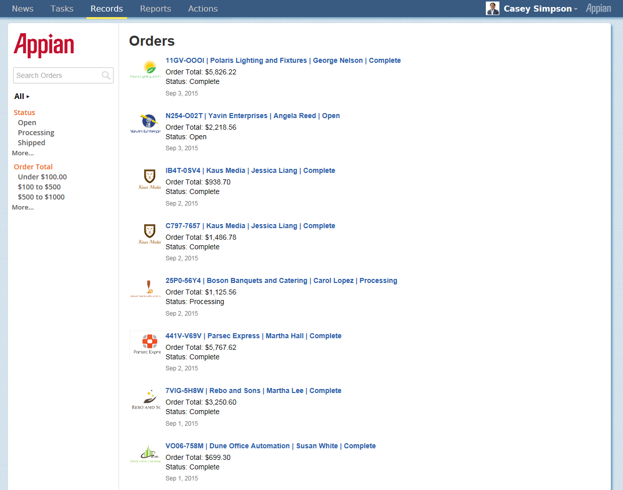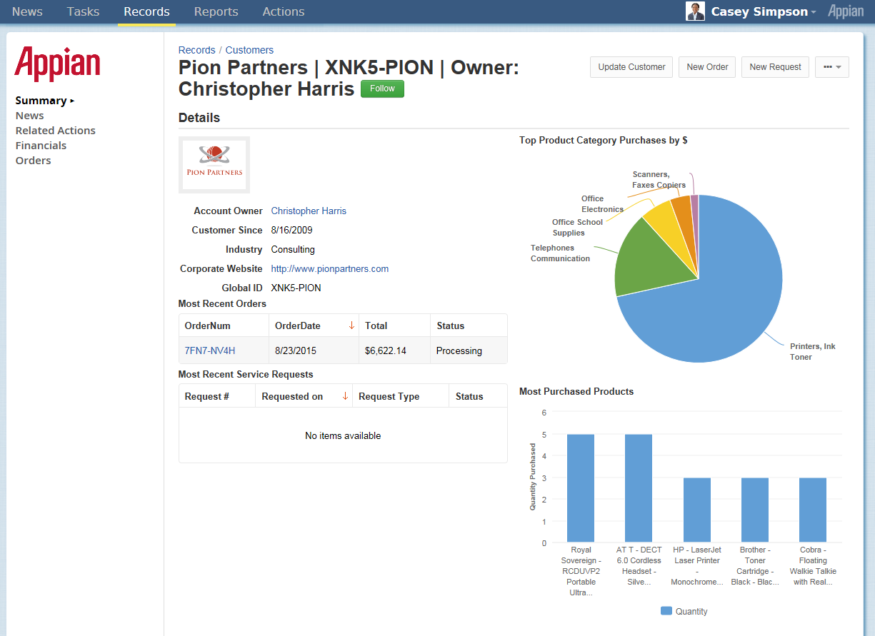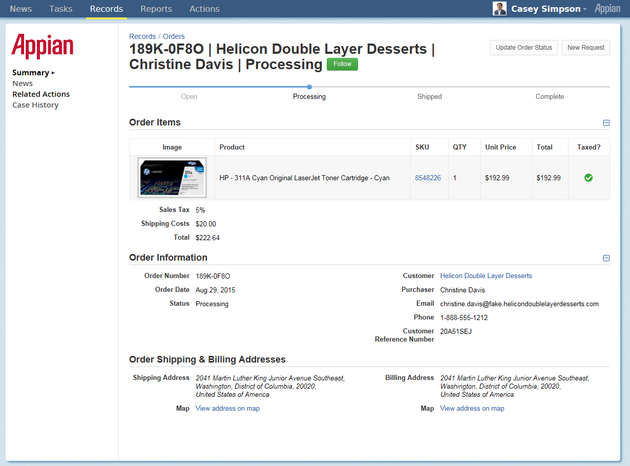 Appian’s Order Management application, part of Appian’s Case Management Framework, provides tools for both order detail and order management (i.e., place, process and ship), enabling better understanding and management of customer orders, improved tracking and inventory management, and easier resolution of customer service requests.