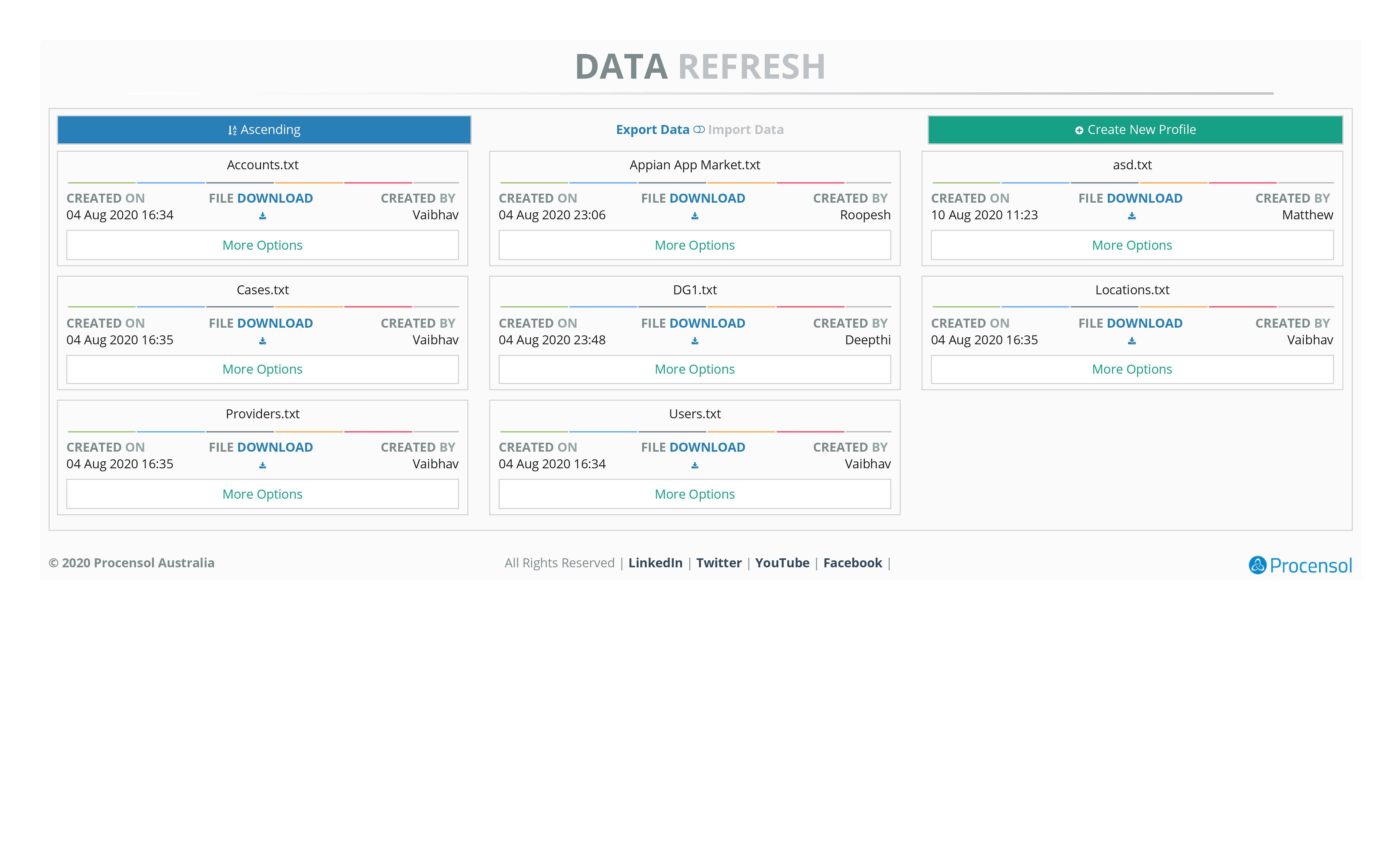 Initiating a profile will return a progress gauge, depicting the overall process completion in real-time. Meanwhile, the requested database content is being fetched, assembled, obfuscated, consolidated and zipped. These stages can be relatively resource intensive, however we’ve sufficiently balanced the load through both batch-processing (with each new process being instantiated on a new Appian engine) and file rolling (throttling based on line/file-size limits).