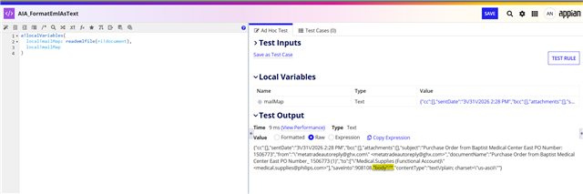 Hi,We are facing an issue in reademlfile(). When an email document containing one or more link address is used such as 'Click here: eur01.safelinks.protection.outlook.com/' in below image, the output body is returned as empty by the function.Below shared are the EML document screenshot that was used for processing and expression rule output -