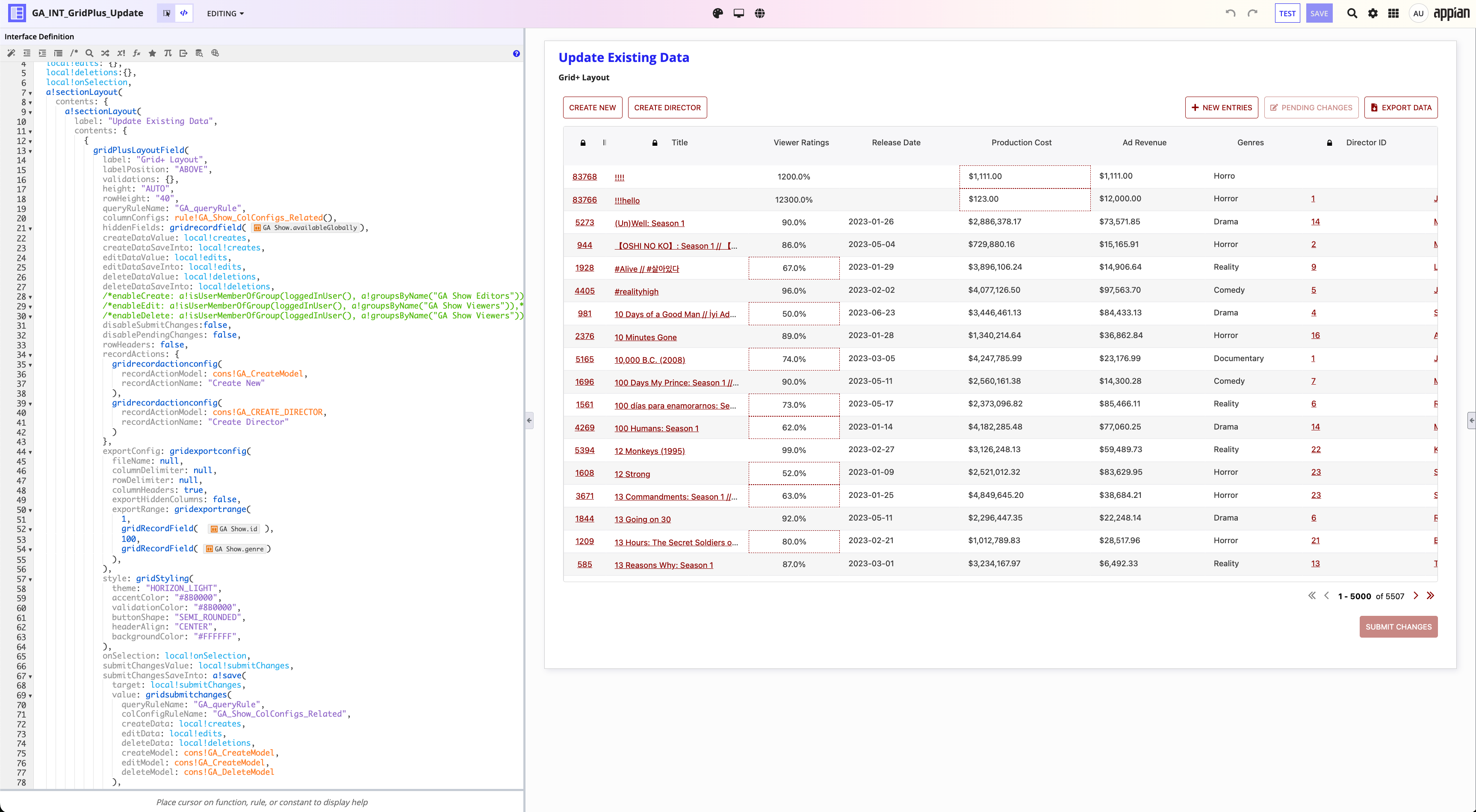 GridPlus is an advanced grid component designed to facilitate efficient, high-volume data entry and interaction directly within the Appian Data Fabric. GridPlus integrates spreadsheet-like capabilities, providing an intuitive and highly customizable user experience. It streamlines the interaction with structured data, simplifying complex tasks such as bulk editing, data validation, and dynamic sorting, all while maintaining robust security and enterprise-level stability. End users can quickly edit individual cells or make bulk changes using multicell selection, and can execute related actions on their selected data. Theming and styling options are also included, enabling users to customize the component’s appearance to match their organization's branding.