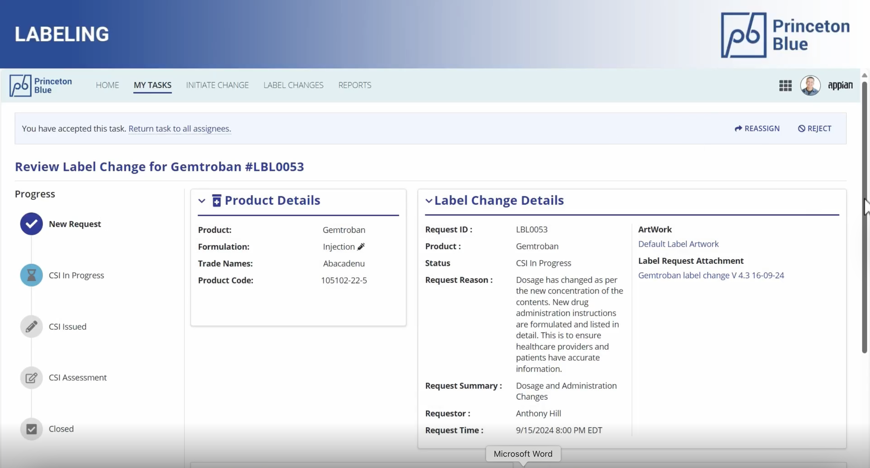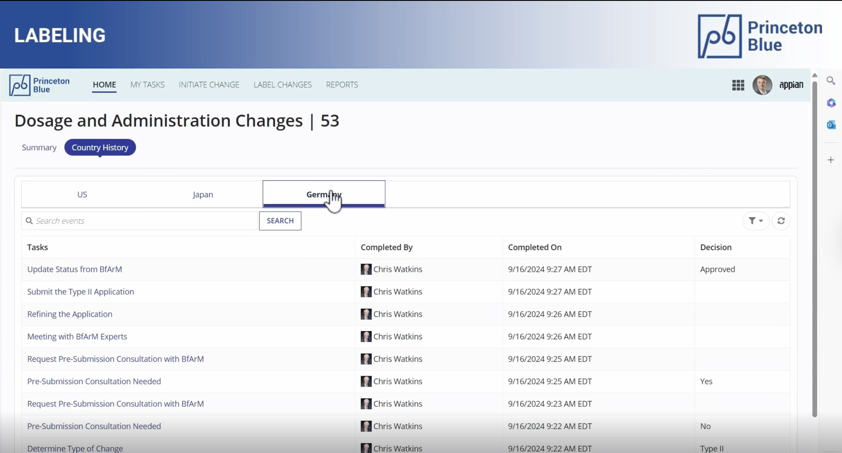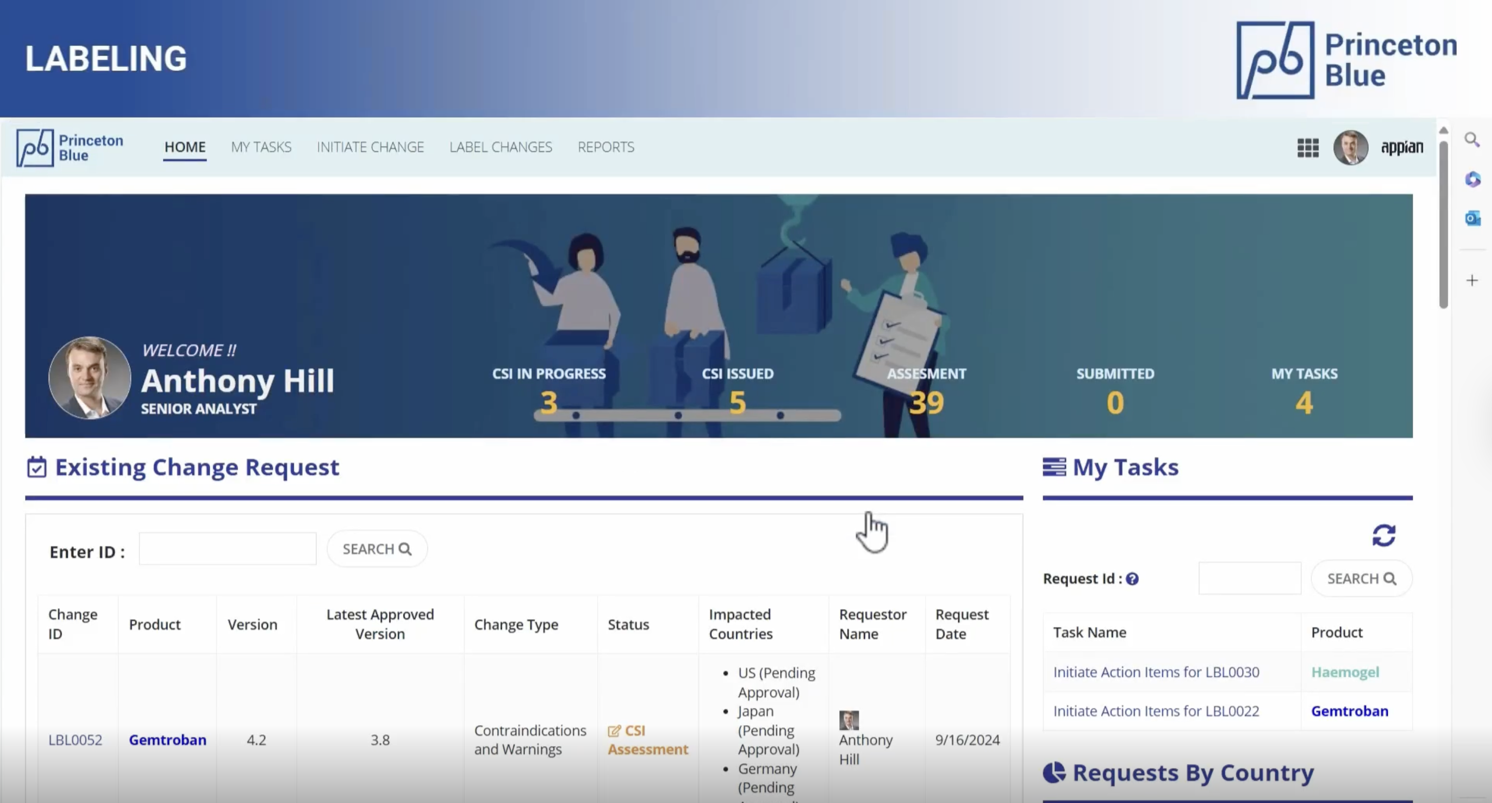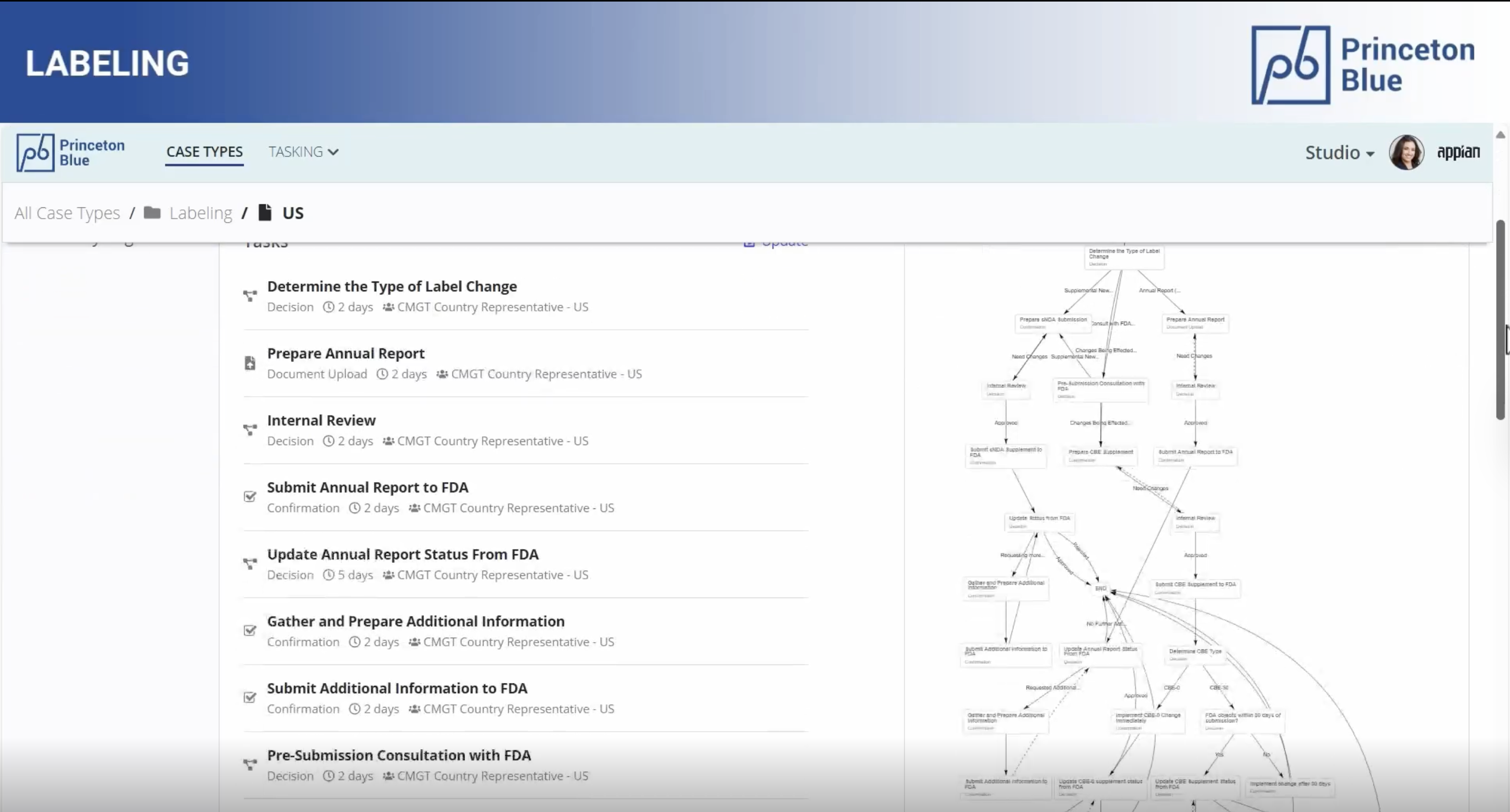 The Labeling solution from Princeton Blue augments your existing systems such as Veeva to automate the workflow and orchestrates collaboration for processing label changes swiftly. The solution leverages Appian’s Case Management Studio to create a controlled, fully auditable, and customizable label change process. It maintains rigorous quality checks and regulatory compliance through multiple review stages, while enabling global teams to customize their workflows to meet their local needs and requirements without any dependence on Headquarters. This approach automates and orchestrates the entire global labeling process, facilitating seamless collaboration among various stakeholders worldwide, without depending on Headquarters or requiring specialized Appian development skills at the local level.