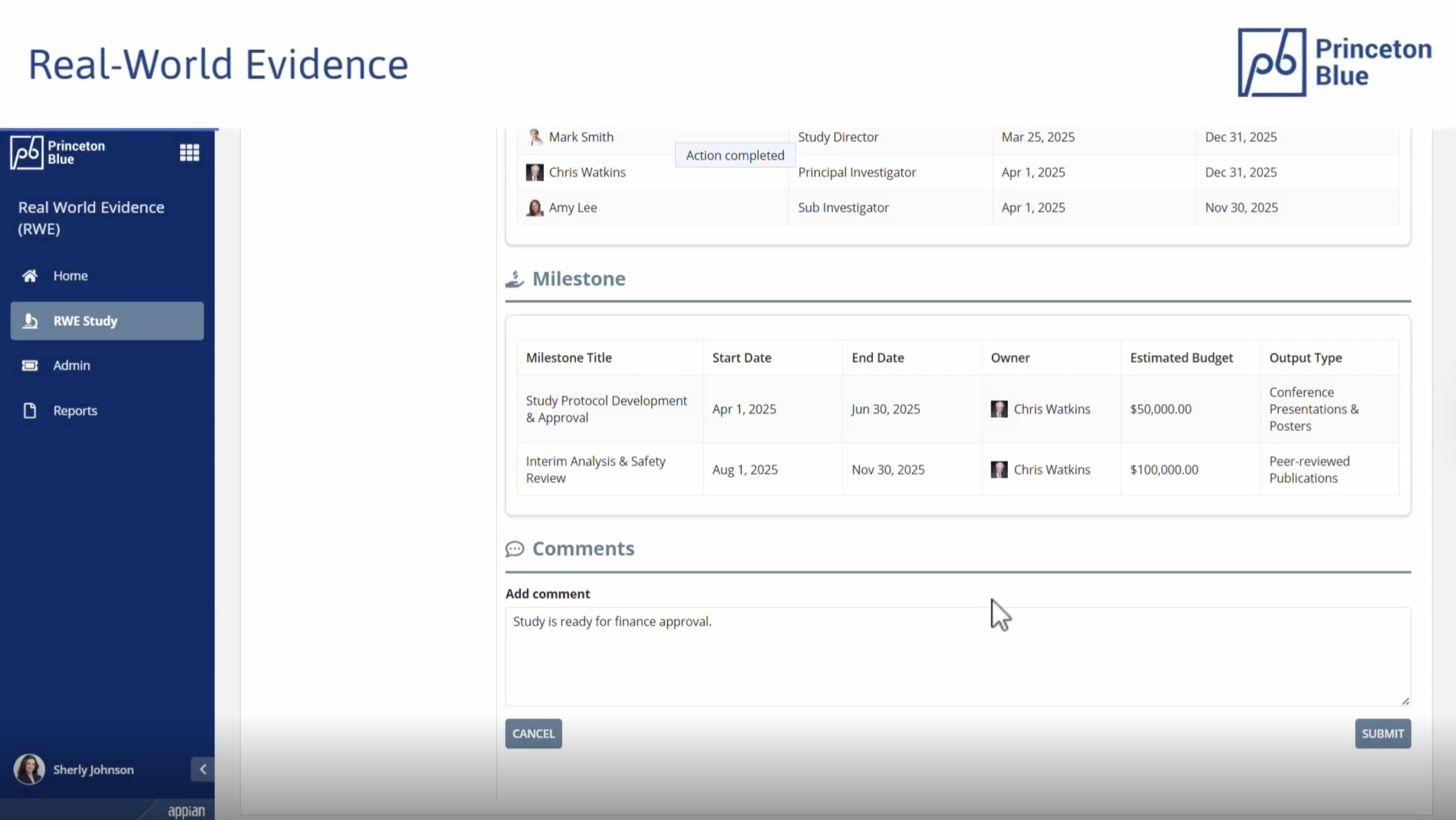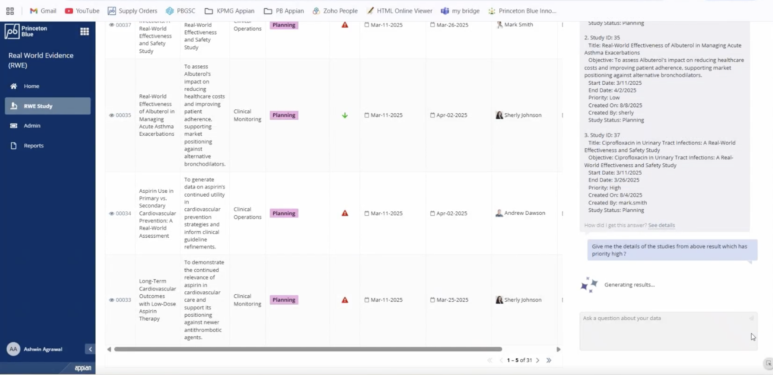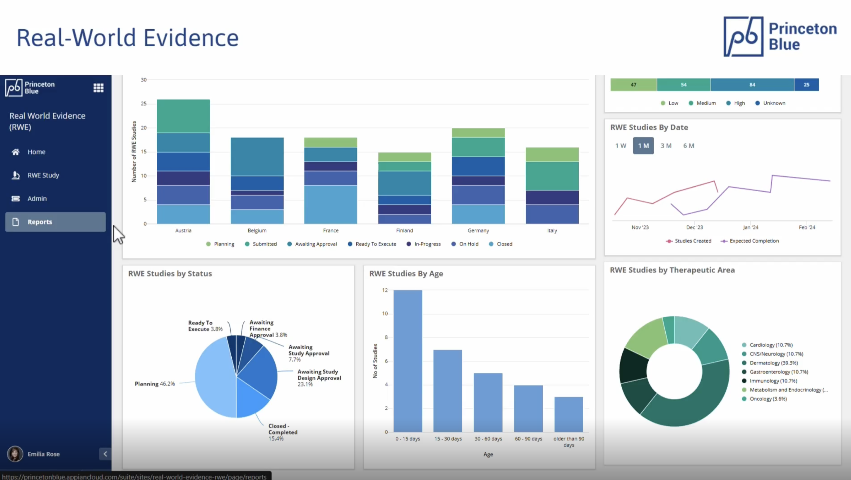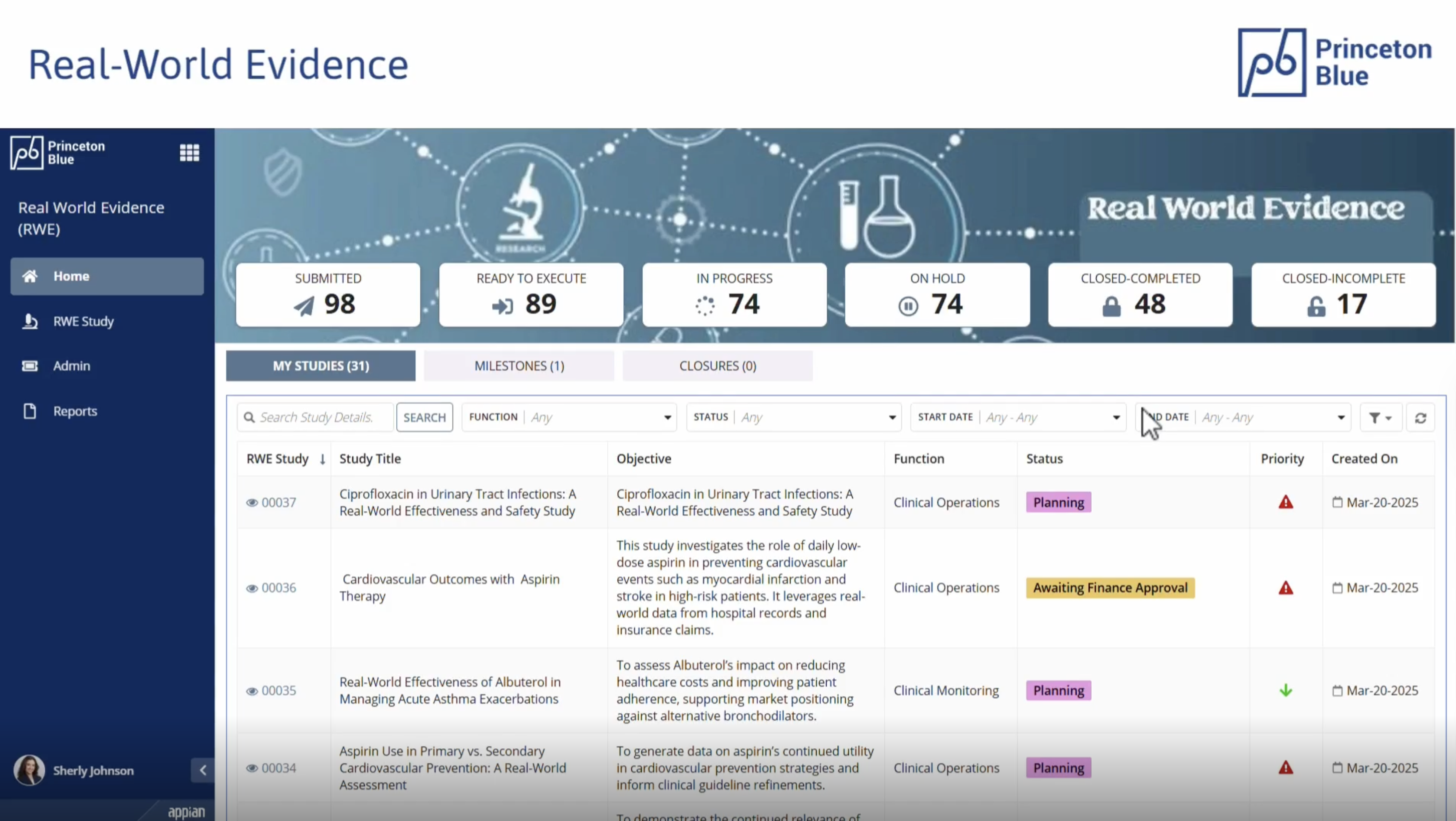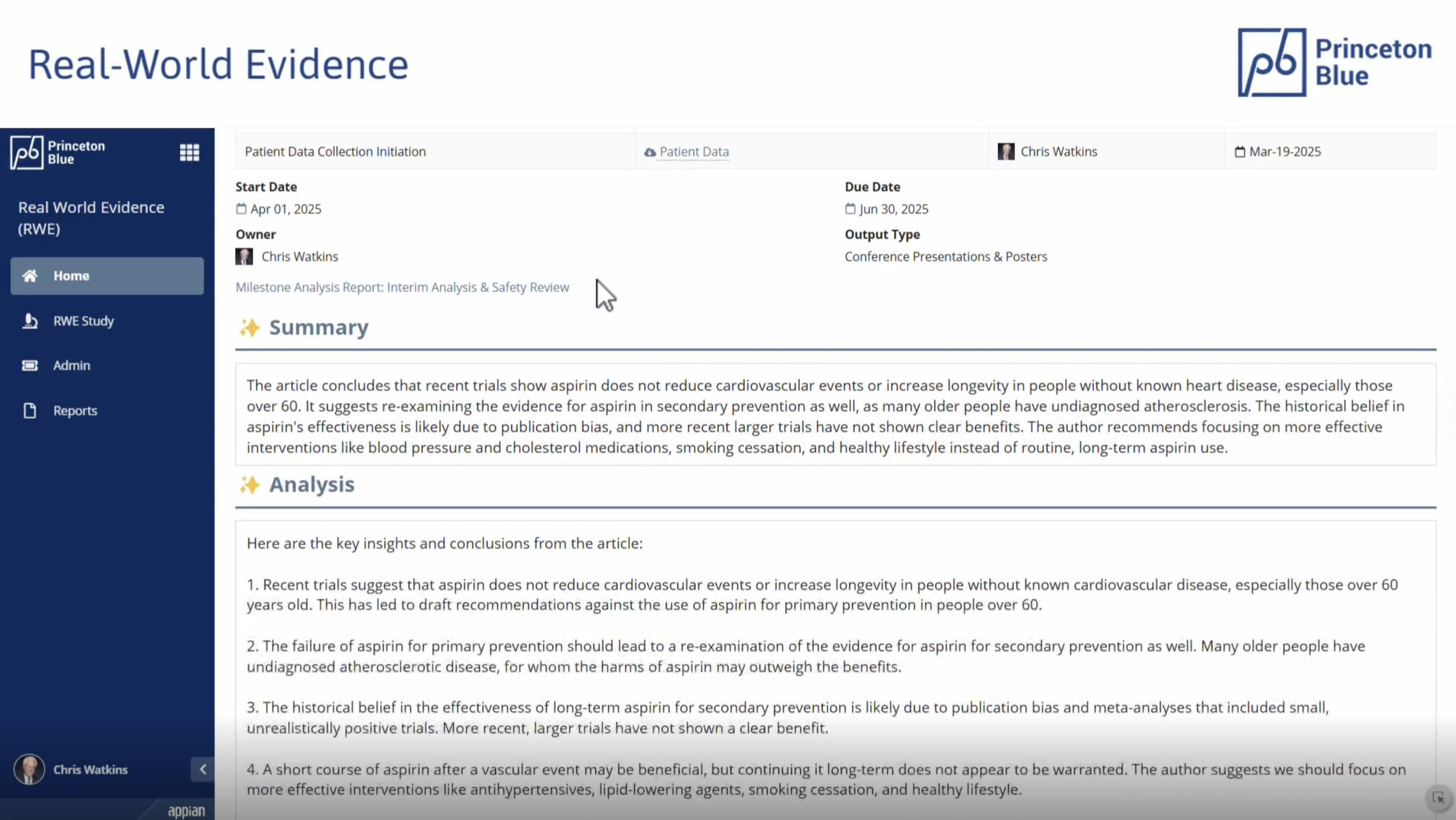 Princeton Blue’s Real-World Evidence (RWE) solution simplifies the organization and tracking of Real World Evidence studies throughout their entire lifecycle. Built on the Appian AI process platform, this solution allows RWE teams to establish a flexible workflow, monitor dynamic milestones, enhance collaboration, and gain valuable insights into study execution. "Real-World Evidence (RWE) studies are instrumental in providing critical insights. These studies support regulatory approvals, market access, and post-market monitoring. Traditional planning and management of these studies with tools such as Spreadsheets, Word documents, SharePoint and Email add unnecessary complexity, do not have transparency and are a risk from a security perspective.