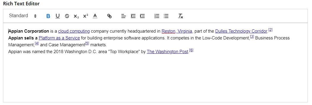 Visit https://community.appian.com/w/the-appian-playbook/1378/end-user-rich-text-editor-component for more information. If you have any problems installing or using the component, please see the https://community.appian.com/w/the-appian-playbook/1603/rich-text-editor-component-plug-in-troubleshooting-guide