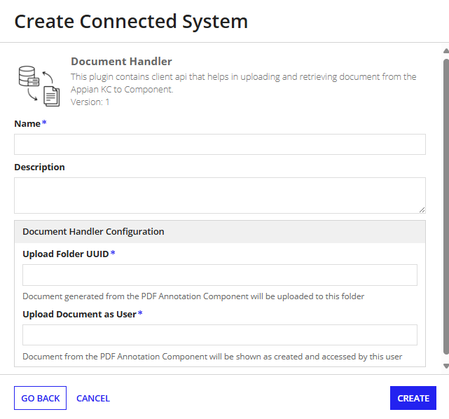 The Document Handler Connected System is used to retrieves and stores documents from the Appian Knowledge Center to the Custom Component. The Client API within this connected system helps transfer data between the Appian Knowledge Center and the component.