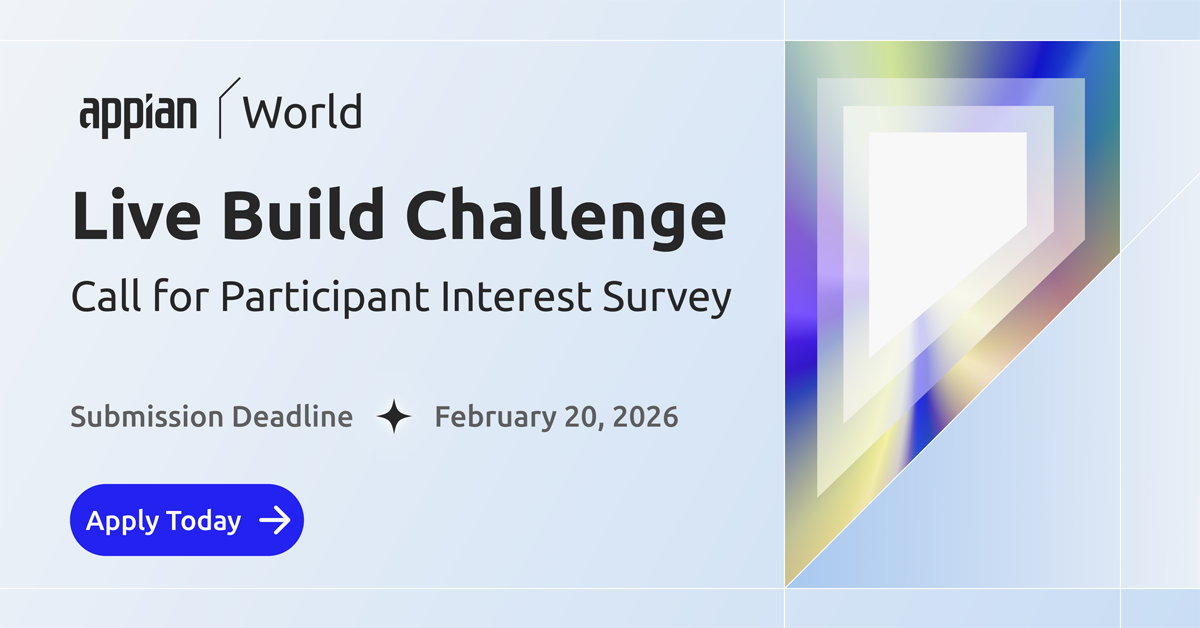 The Appian World Live Build Challenge is back for its 6th year! This crowd favorite showcases developer skill and speed using the Appian Platform. Apply now for a chance to compete for a $15,000 prize and eternal glory. Selected participants will receive a free conference pass and hotel stay.