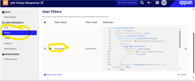 a!recordFilterList( name: "Assignee", allowMultipleSelections: true, options: a!localVariables( local!assignees:a!queryRecordType( recordType: 'recordType!{4390cf3b-8f80-4bfd-adfa-b06cb2562f7d}Job Corps Response', fields: { a!aggregationFields( groupings: a!grouping( field: 'recordType!{4390cf3b-8f80-4bfd-adfa-b06cb2562f7d}Job Corps Response.fields.{assignee}assignee', alias: "assignee" ) ) }, pagingInfo: a!pagingInfo(startIndex: 1, batchSize: 500) ).data, local!assigneesList:property(local!assignees,"assignee",null), a!forEach( items: local!assigneesList, expression: a!recordFilterListOption( id: fv!index, name: fv!item, filter: a!queryFilter( field: 'recordType!{4390cf3b-8f80-4bfd-adfa-b06cb2562f7d}Job Corps Response.fields.{assignee}assignee', operator: "=", value: fv!item ) ) ) ))