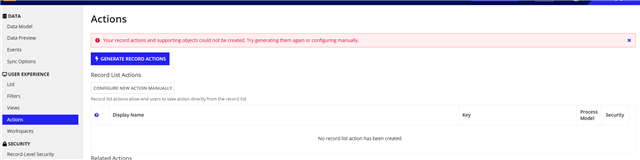 Whenever we click “Generate Record Actions” on a Record Type an error is displayed to user like below, this issue seems to have a higher changes of occurring for record types that contains data/rows in database.