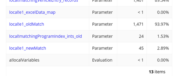 This is a screenshot from the performance tab of a sandbox rule I made to compare the scenario's old way of data processing to the method that uses fn!filter. The term "e1" in the variable names represents just 1 row of the excel upload, so when a user uploads 20 rows there are substantial performance gains to be found when performing this mapping. The 3rd column is how many milliseconds it took to process each variable.