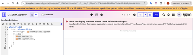 Try this,Open LIS Supplier Record Type and manually full sync.Open record type and fix list grid columns data.As i can see banner on top of your screenshot seems to be a upgrade issue please wait meanwhile appian fix it.