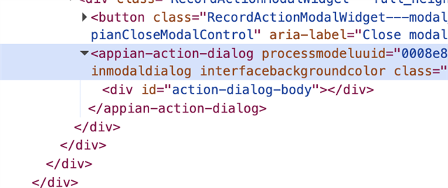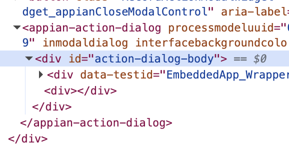 Upon inspection, we observed that the <appian-dialog-body> HTML tag is empty when the action is initiated through the IFrame, which is not the case when accessed natively within Appian.