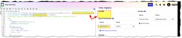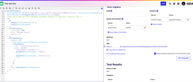 To meet this requirement, I have created an Appian Web API that exposes the document when the document ID is passed as a parameter. However, I am unable to test the API within Appian as it is giving 404 error while I'm testing it.