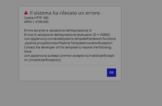 Il sistema ha rilevato un errore Codice HTTP: 500 APNX-1-4198-000 Errore durante la valutazione dell’espressione UI Errore di valutazione dell’espressione (evaluation ID = YGR65): com.appiancorp.connectedsystems.templateframework.functions.pipeline.proxyDecoratorPipeline.TemplateInvocationException com.appiancorp.suiteapi.common.exceptions.InvalidUserException