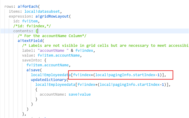 rows: a!forEach( items: local!datasubset, expression: a!localVariables( local!rowIndex: where(local!originalArray.id = fv!item.id), a!gridRowLayout( contents: { ....