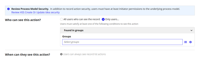 In the Record you have option to secure related actions for groups. Go to Views and Actions Security under Security header. Click on Actions header. Click on the pencil icon at top right corner of Action to open the security configuration dialog box. You can add the permitted group for the action here. You can also configure groups from this it should not be visible using expression like not(a!isUserMemberOfGroup(username:loggedInuser(),groups:groupConstant)).