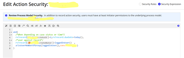 For example below, I am allowing my action be visible to the user who created the record, they are part of a specific group, when record statusId is 2 and record's Due Date is today() - then only action should be visible. [P.S. the dueDate is added for the sample, I don't have such a field in my record so its just for example]