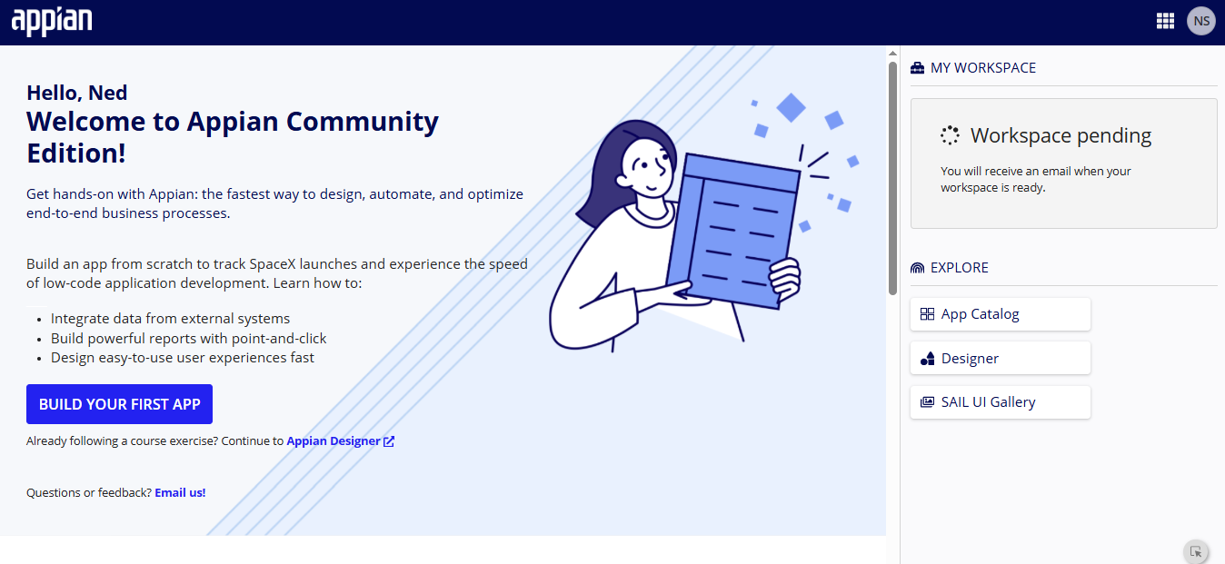 Hello, I’m currently using the free Appian Community Edition. After being inactive for ~1 month, I logged back in and my environment has been stuck on “Workspace Pending” for the past 24 hours. Is this normal, and how much longer should I expect before I can access my workspace again? Any guidance would be appreciated.