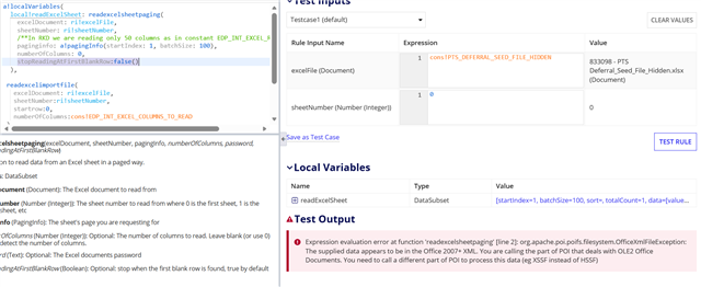 Expression evaluation error at function 'readexcelsheetpaging': org.apache.pol.openxml4j.exceptions.OLE2NotOfficexmlFileException. The supplied data appears to be in the OLE2 Format. You are calling the part of POI that deals with OOXML (Office Open XML) Documents. You need to call a different part of POI to process this data (eg HSSF Instead of XSSF)