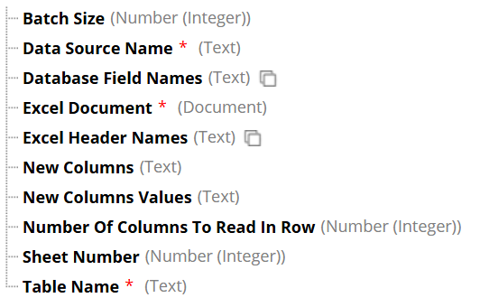 • The parameters are mapped correctly and I had also verified the Excel headers with table column names. Following is the plugin param list which I am using and the Database Field Names are passed as a constant value. Both DB field name and excel headers have 22 items and are passed as constants. Even the spellings are verified multiple times.