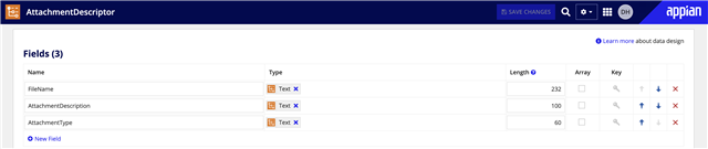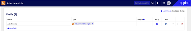 As seen in the screenshots above, ‘AttachmentList’ contains one field called ‘Attachments’, where ‘Attachments’ is an array of ‘AttachmentDescriptor’ data types. These two CDTs share the same namespace.