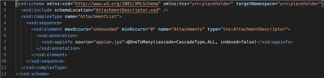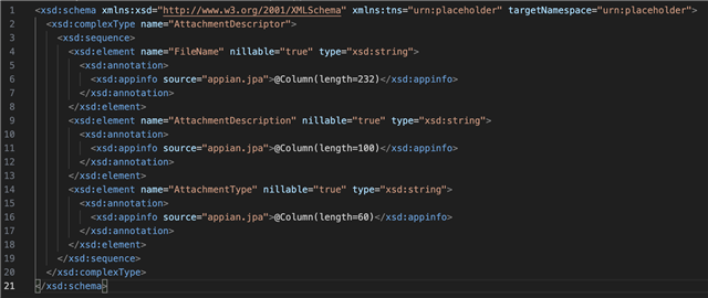 In Appian, I have two CDTs called ‘AttachmentList’ and ‘AttachmentDescriptor’. They were generated from ‘AttachmentList.xsd’ and ‘AttachmentDescriptor.xsd’, respectively.