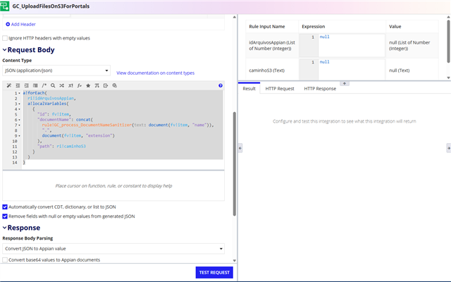 I tried changing the document name through an expression rule before passing it to the integration, attempting to sanitize it beforehand, but it did not work. I also tried setting the fileNames parameter directly on the S3 integration node, but the result was the same.