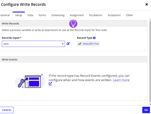 I am creating a practice application that takes in a pet's owner, and the pets that the owner has. Because the owner can have more than one pet, I have created an editable grid that passes the input pets in to a rule input that stores them as a "list of recordType!w0428pv pet". I would like to be able to use the write records smart service to take that list and input it in to the database as individual records but I'm not sure if that is possible or the right way to go about doing this. I believe the process variable is storing the array of pets correctly, as it looks correct in the preview on the design page. Any advice would be greatly appreciated!