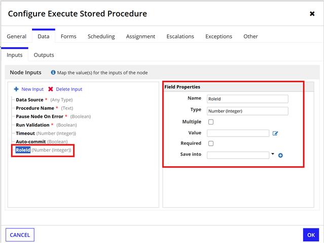 Make sure RoleId matches exactly the stored procedure parameter name, including case.Delete the old parameter mapping and re-add it fresh in the Smart Service node.Define all IN and INOUT parameters even if you pass null to some.
