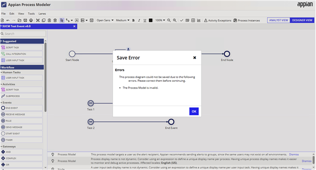 I am getting some error while trying to save a process model, but I am not able to identify what I am doing wrong. Please find the screenshot of the Error as follows:Please note that I am able to save and publish this successfully, which is very strange.