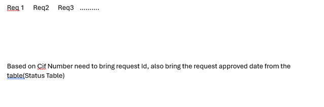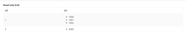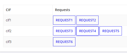 ok, I need to implement one grid with all request Ids related to the cif. One cif may have one one request,other cif may have multiple request. The grid structure as shown above and dynamic grid. examples( cif-112233 may have 123456,786535 requests and other cif may have cif-345678 ,requests(432167,654328,876543,7655433) like so on