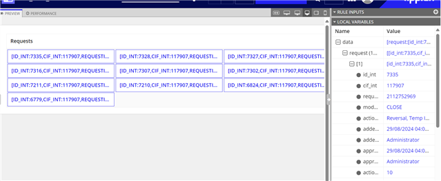 a!localVariables( local!moduleStatus: a!map( request: rule!CR_QE_getApprovedCAsByFilters( requestId_int: ri!requestId_int, cif_int: ri!cif_int ) ), { a!buttonArrayLayout( buttons: a!forEach( items: fv!row.request, expression: a!buttonWidget( label: joinarray( {fv!item.requestId_int & fv!item.actionType_txt & fv!item.approvedOn_dt}, " - " ), value: joinarray( {fv!item.requestId_int & fv!item.actionType_txt & fv!item.approvedOn_dt}, " - " ) ) ) ) } )