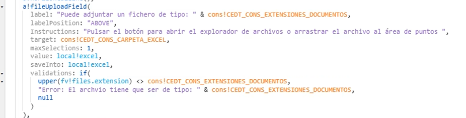 That the uploaded file name (converted to string) contains the .xlsx extension, which I have defined in a constant (cons!CEDT_CONS_EXTENSIONES_DOCUMENTOS).