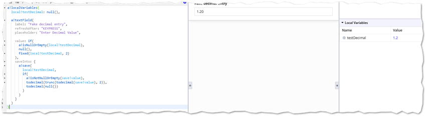 a!localVariables( local!testDecimal: null(), a!textField( label: "Fake decimal entry", refreshAfter: "KEYPRESS", placeholder: "Enter Decimal Value", value: if( a!isNullOrEmpty(local!testDecimal), null(), fixed(local!testDecimal, 2) ), saveInto: { a!save( local!testDecimal, if( a!isNotNullOrEmpty(save!value), todecimal(trunc(todecimal(save!value), 2)), todecimal(null()) ) ) } ) )