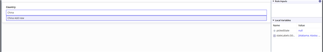 a!localVariables( local!countries: { "USA", "India", "Canada" }, local!selected: null, a!pickerFieldCustom( label: "Country", suggestFunction: rule!POC_CountrySuggest( filter: _, labels: local!countries, identifiers: local!countries ), value: local!selected, saveInto: local!selected, selectedLabels: local!selected ) )