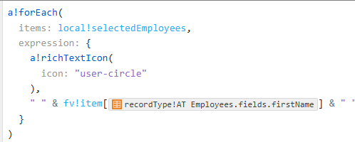 I'll explain my problem a little bit deeper; I'm trying to get some of the properties from the RecordType "Anomalie", i would like to use the expression rule with get me all of the anomalies linked to a specific pension by the pensionid, and get the description, the name, the action related to it. But i'm having trubles indexing these properties once I call the expression rule. When I try to use fv!item.description into the description rich text field it seems like it doesn't recognize the object as a record type.